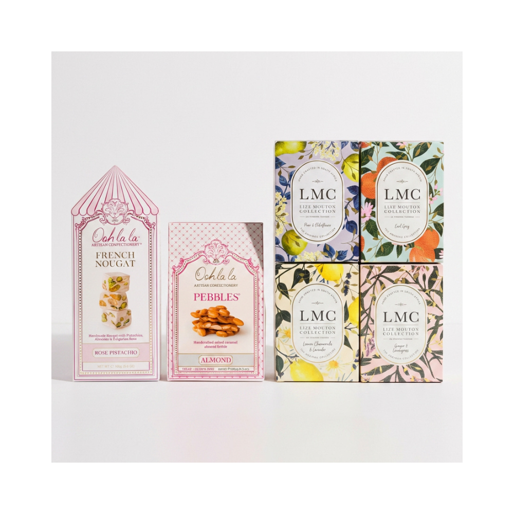 Ooh la la Artisan Confectionery, LMC, confectionery gift, gourmet sweets, nougat, salted caramel nougat, chocolate pecans, white chocolate pecan pebbles, almond pebbles, rooibos tea, rooibos collection, artisanal treats, premium gifting, small‑batch confectionery, tea and confectionery, South African confectionery