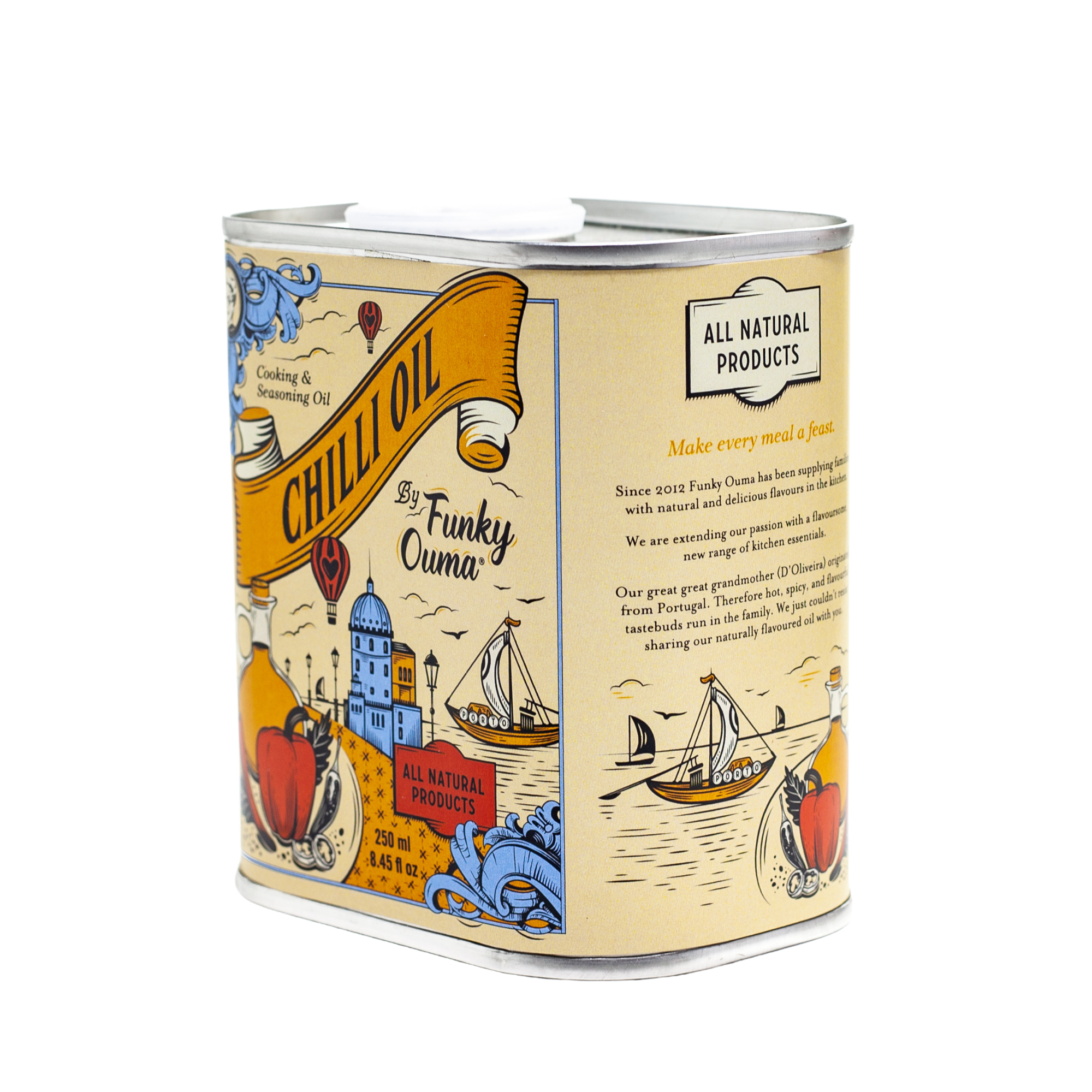Funky Ouma Chilli Oil brings heat, flavour, and heritage together in one beautifully balanced bottle. Inspired by the family’s Portuguese roots, this naturally flavoured oil delivers a warm, spicy kick that elevates everyday meals with ease. Whether drizzled, blended, or used as a finishing touch, it adds depth and vibrancy to a wide range of dishes.