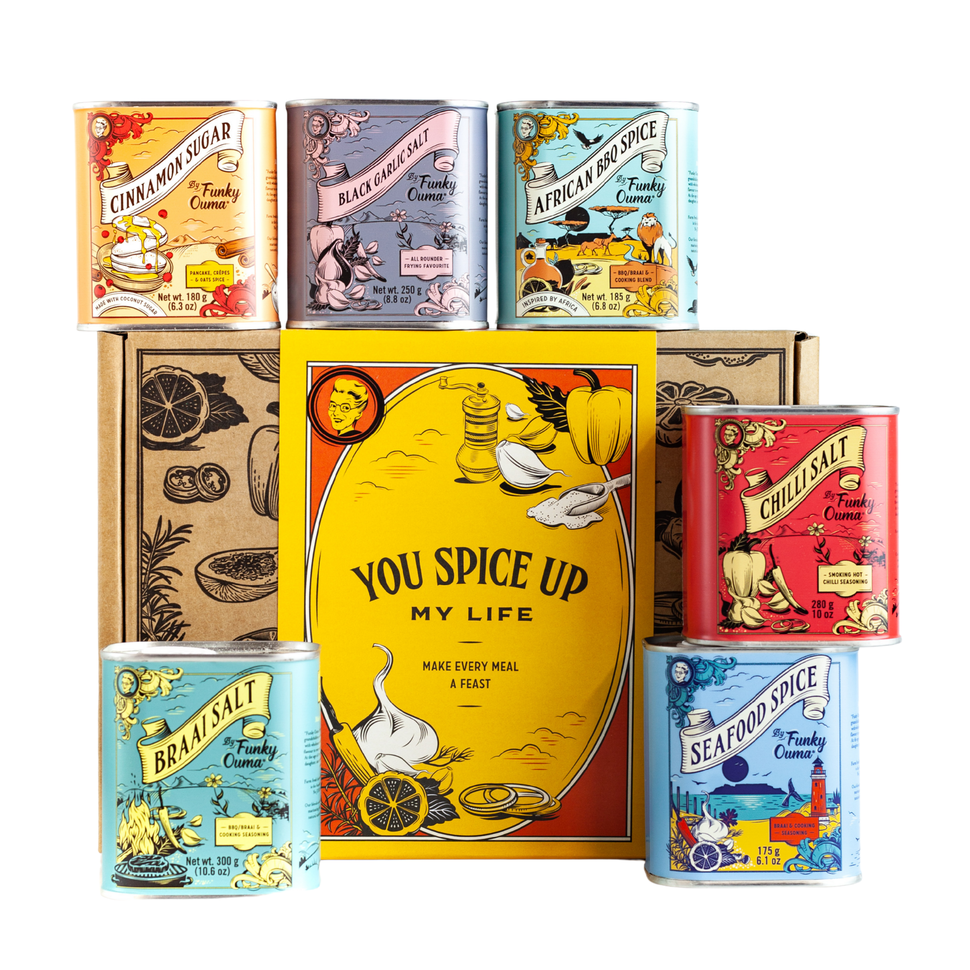A vibrant, flavour‑forward collection curated by Funky Ouma to bring excitement, colour, and bold seasoning to every kitchen. The You Spice Up My Life Gift Box with Sleeve is a ready‑to‑enjoy assortment of some of Funky Ouma’s most loved salts and spices, beautifully presented and perfect for gifting. Each tin offers its own character, from warm cinnamon sweetness to robust braai flavours and aromatic seafood blends.