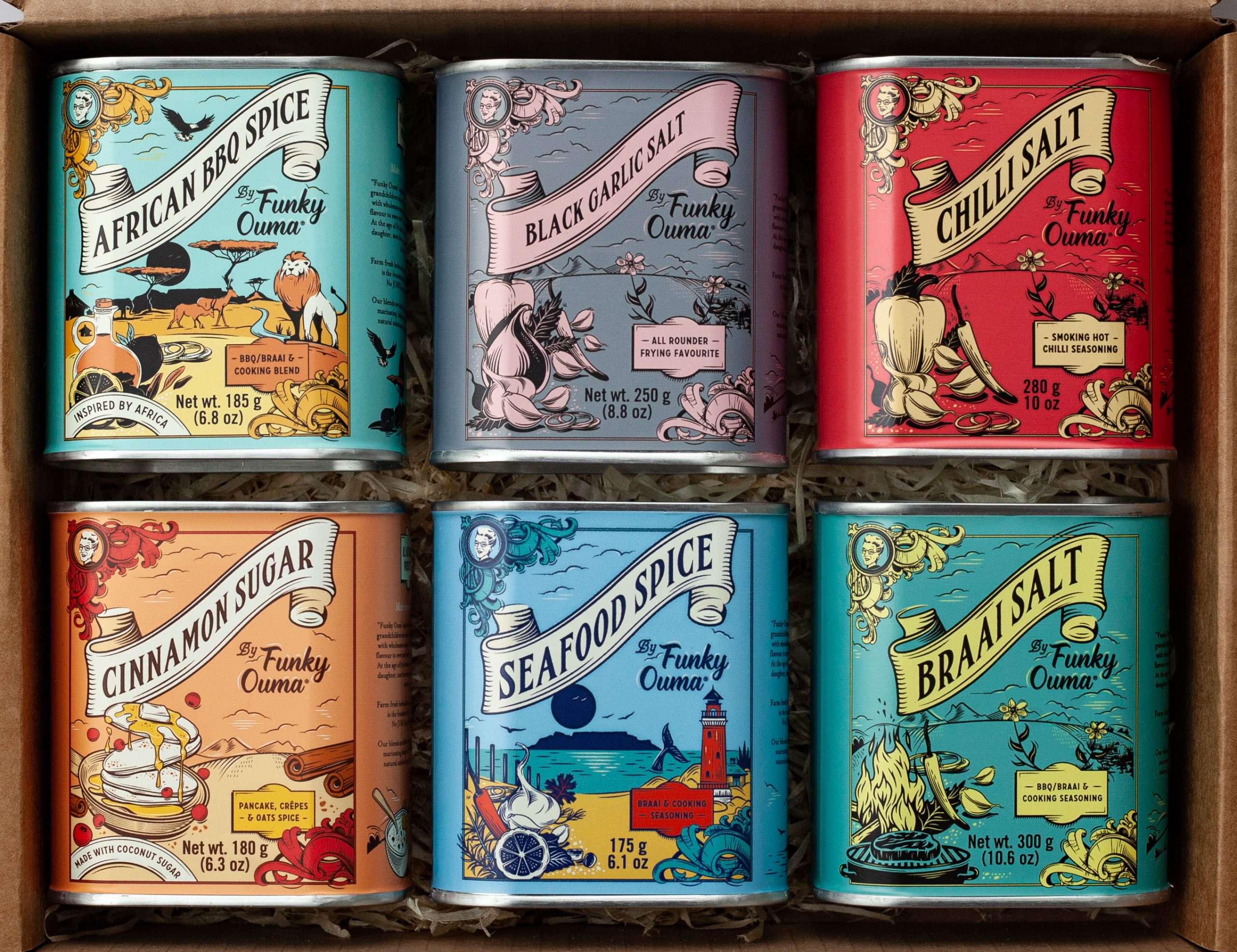 A vibrant Funky Ouma gift box featuring six flavour‑packed salts and spices. Perfect for cooking, gifting, and adding bold character to everyday meals. Beautifully presented with a custom sleeve.