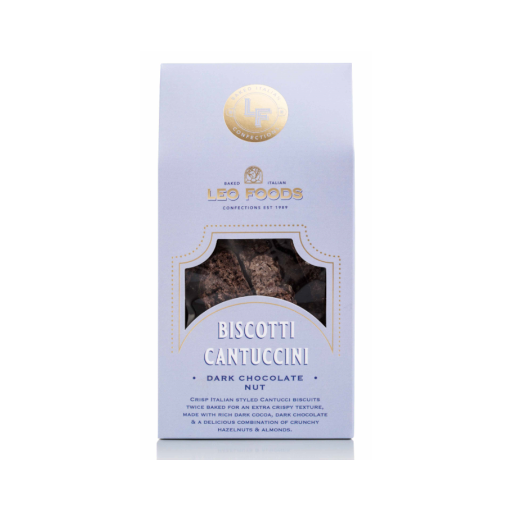 Biscotti Cantuccini Dark Chocolate Nut from Leo Foods are crisp, twice‑baked Italian‑style biscuits made with rich cocoa, dark chocolate, and a generous blend of hazelnuts and almonds. Their firm, crunchy texture makes them ideal for dipping, while the combination of chocolate and nuts delivers a balanced, aromatic flavour.