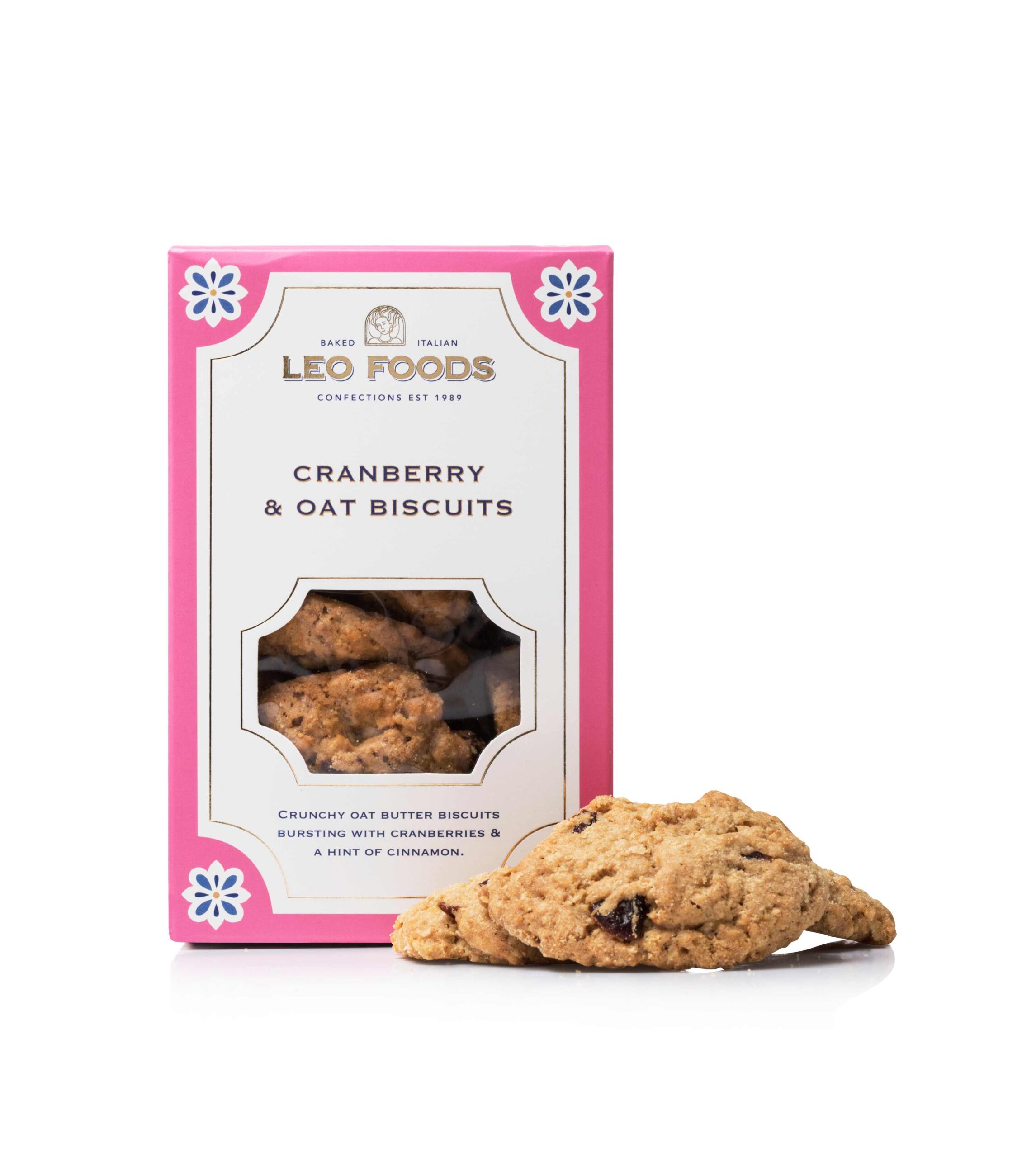 Crunchy oat and butter biscuits with tart cranberries and a hint of cinnamon. A wholesome, flavourful treat from Leo Foods, perfect for tea‑time or light snacking.
