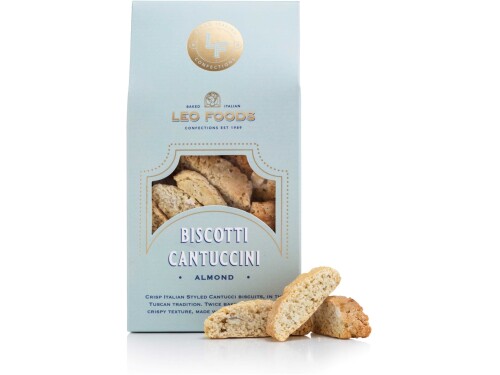 Soft, chewy Italian‑style amaretti with a glorious almond and orange flavour. Crafted by Leo Foods using a generous 39% almond content for authentic texture and aroma. A refined biscuit for pairing with coffee, gifting, or enjoying as a gentle sweet treat
