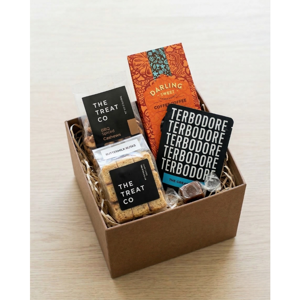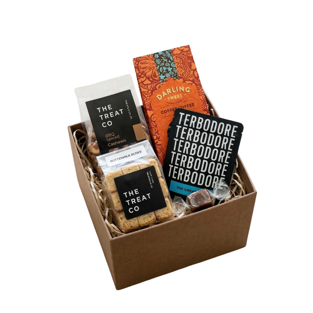 A warm, thoughtful mini gift box featuring premium South African coffee and handcrafted treats. Choose the curated selection or customise the contents, box colour, and ribbon for a personal touch. Compact, elegant, and perfect for any occasion