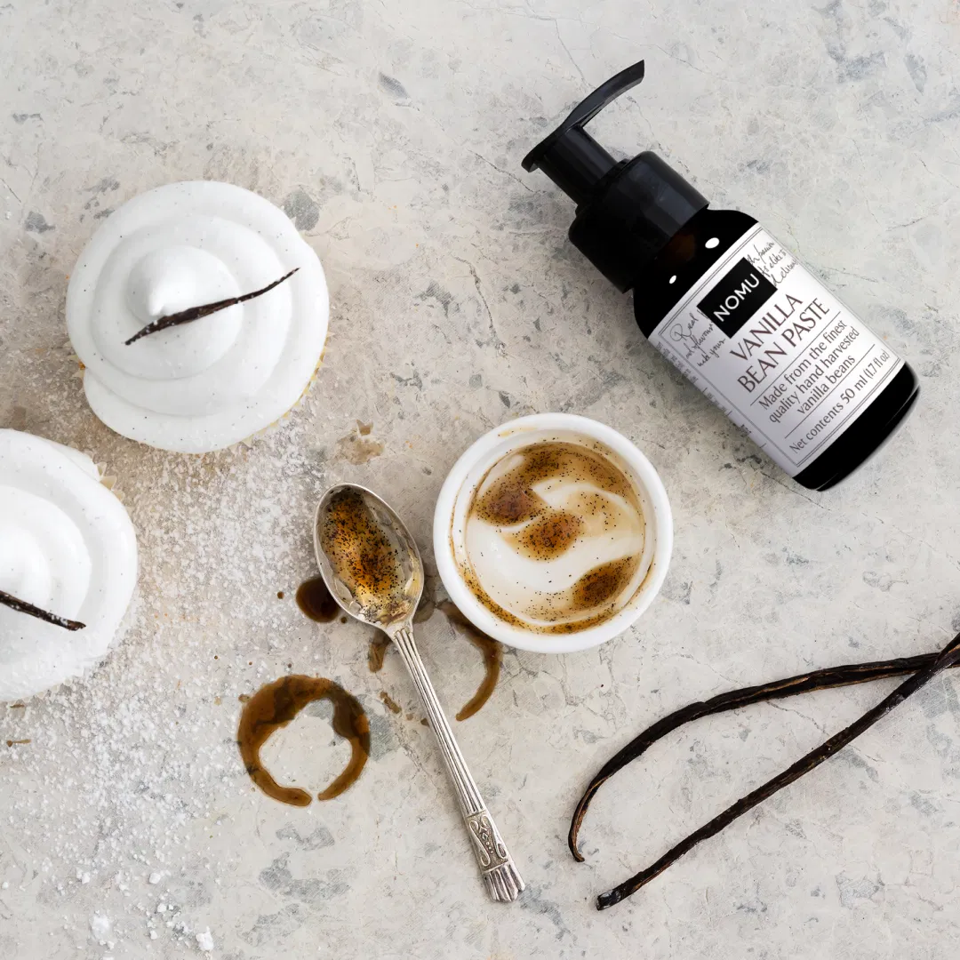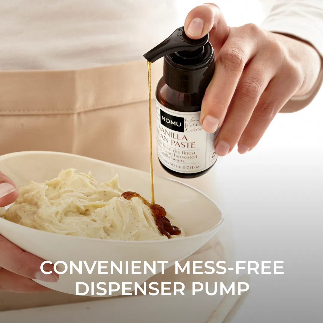 This paste combines pure vanilla seeds with cold‑pressed Vanilla Extract and is presented in NOMU’s award‑winning, mess‑free dispenser pump. The paste format ensures even distribution of visible vanilla seeds, giving every creation a professional, flavour‑packed finish.