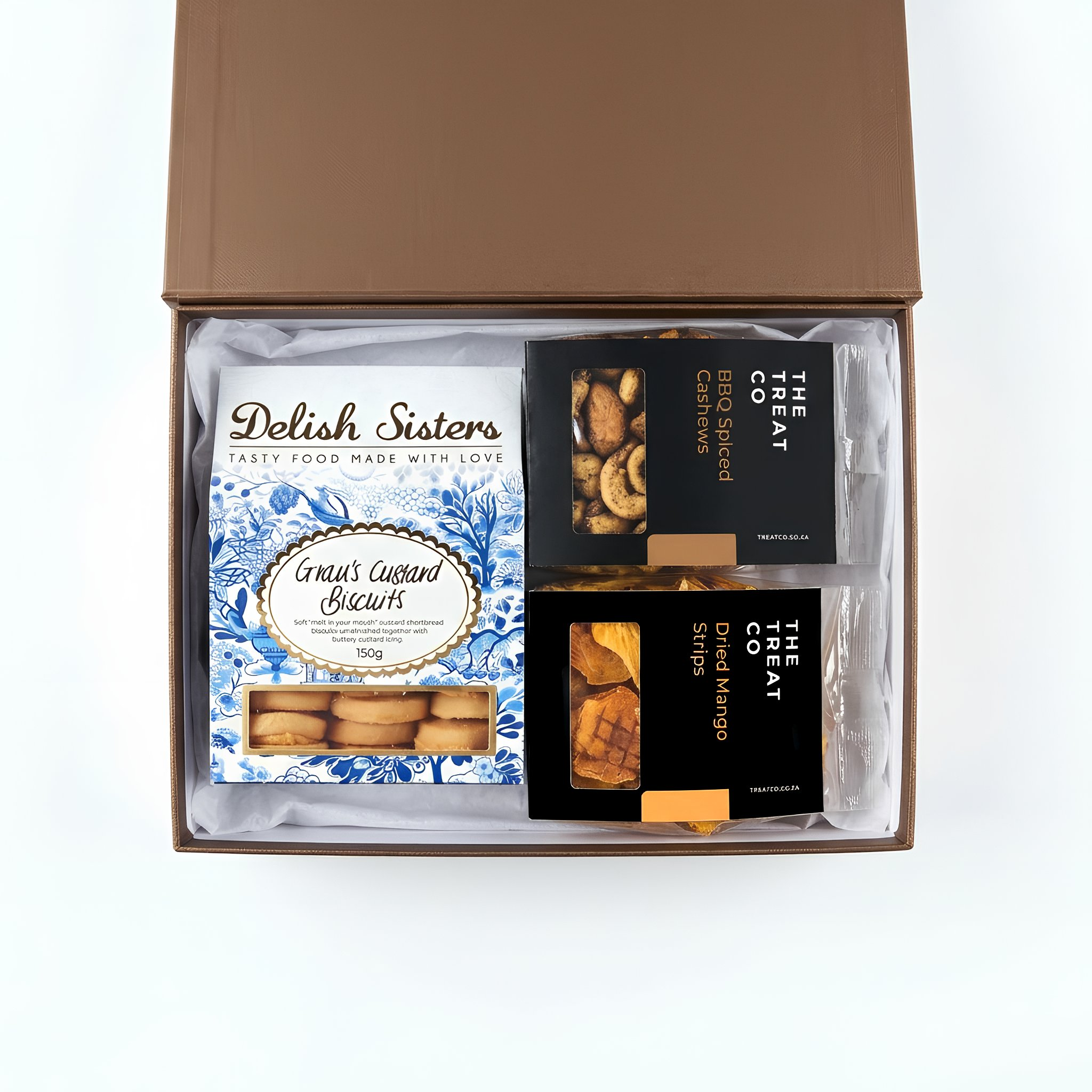 Inside, you’ll find The Treat Co. Dried Mango, naturally sweet and tangy with no added sugar — simply real fruit, gently preserved for clean snacking. For a savoury moment, The Treat Co. Roasted & Salted Mixed Nuts offer a premium blend of peanuts, cashews, almonds, brazil nuts and macadamias, lightly seasoned and roasted for a warm, satisfying crunch. And to finish, Delish Sisters Gran’s Custard Biscuits bring a soft, melt‑in‑your‑mouth sweetness, sandwiched with buttery custard icing — a treasured family recipe that feels like home.