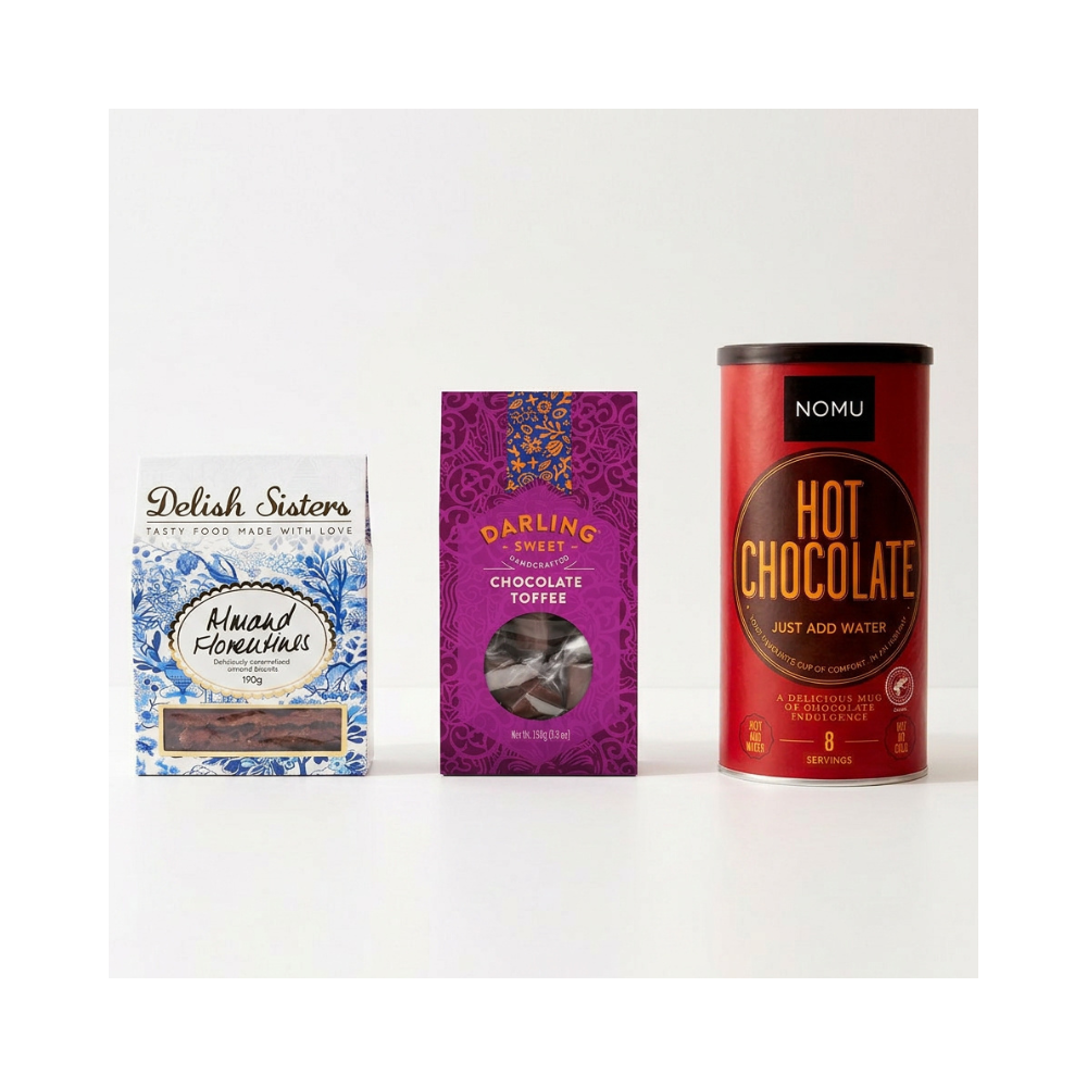 A warm, winter‑ready gift set featuring NOMU’s chef‑crafted hot chocolate, Darling Sweet’s nostalgic chocolate toffees, and Delish Sisters’ contemporary almond florentines. A refined, comforting selection for slow evenings and thoughtful winter moments.